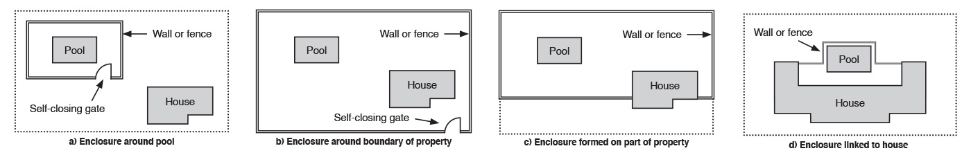 As can be seen by the below illustration, a fence surrounding a property containing a swimming pool, satisfies the above-mentioned requirements, without a separate fence around the pool being needed.
