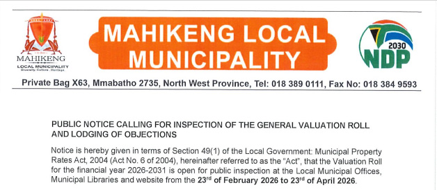The Mahikeng Local Municipality (“MLM”) has extended an invitation to all property owners who desire to object to their newly released 2026 General Valuation Roll (“GVR”) in terms of Section 49(1) (a) (ii) read together with Section 78(2) of the Local Government: Municipal Property Rates Act from the 23rd of February 2026 to the 23rd of April 2026.